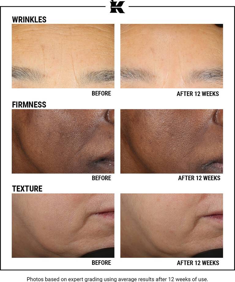 Wrinkle and firmness results based on expert grading in a clinical test for subjects showing improvement after 12 weeks of use. Texture results based on a consumer test after 12 weeks of use.