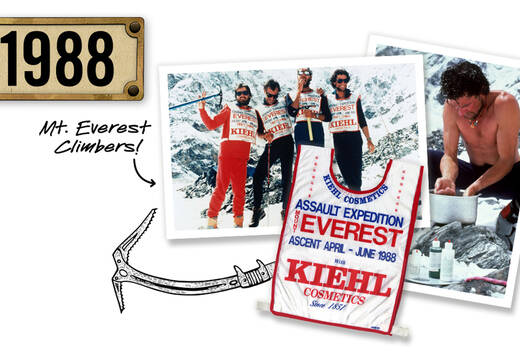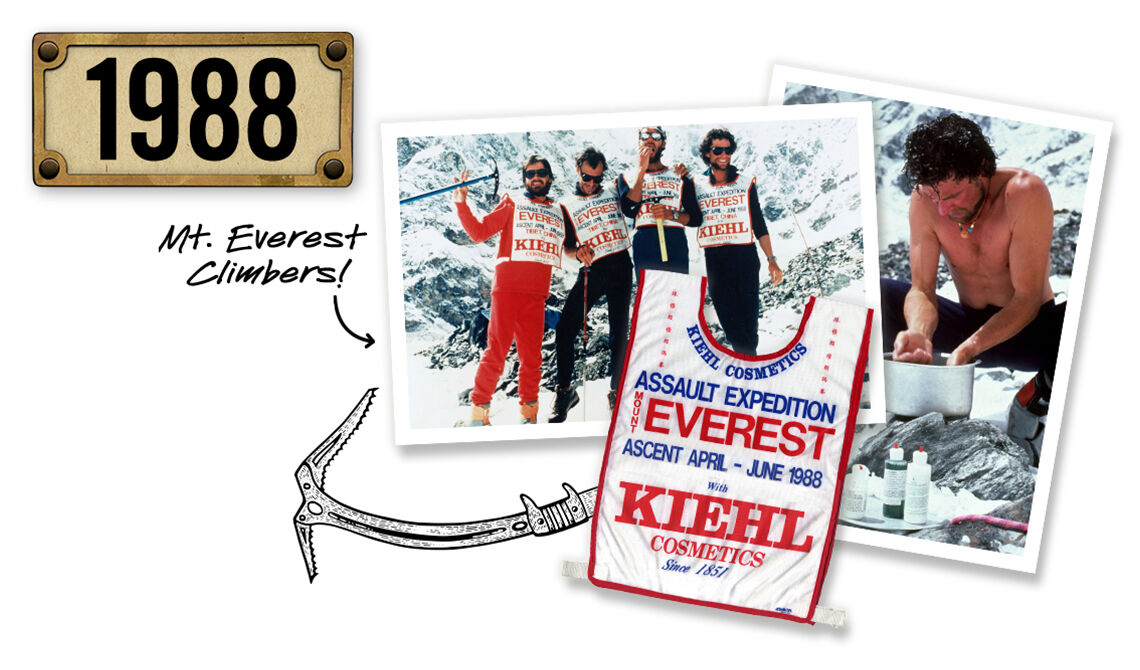 Kiehl’s sponsors the Everest ’88 Expedition as climbers scale Mount Everest — the first ascent of the mountain’s east face without supplemental oxygen — taking along several Kiehl’s products to support them on their heroic journey.
